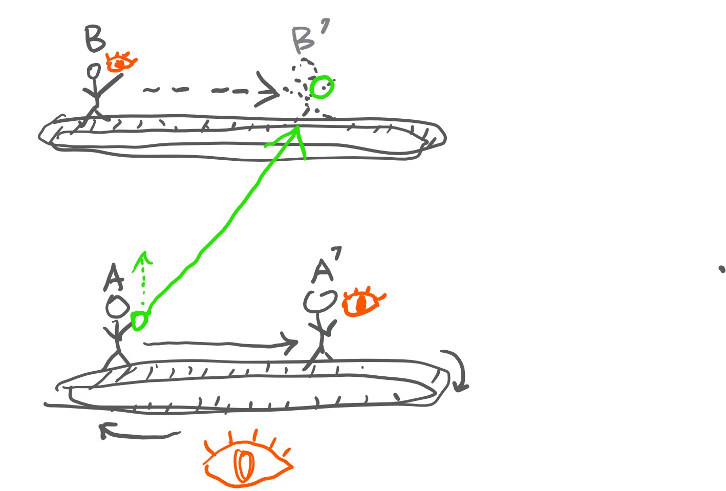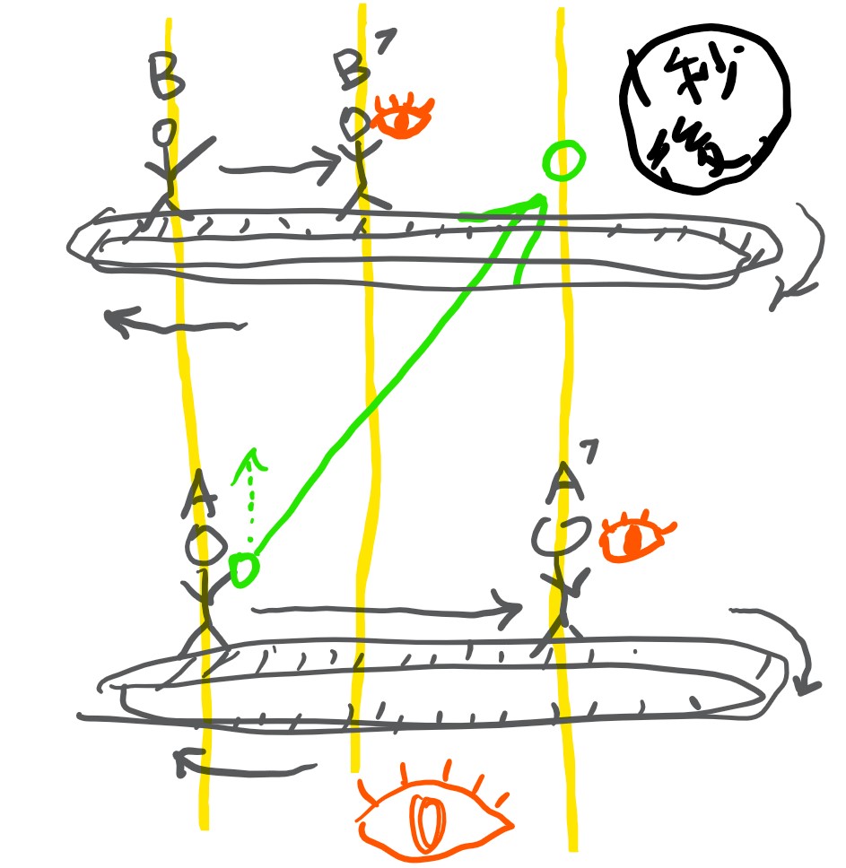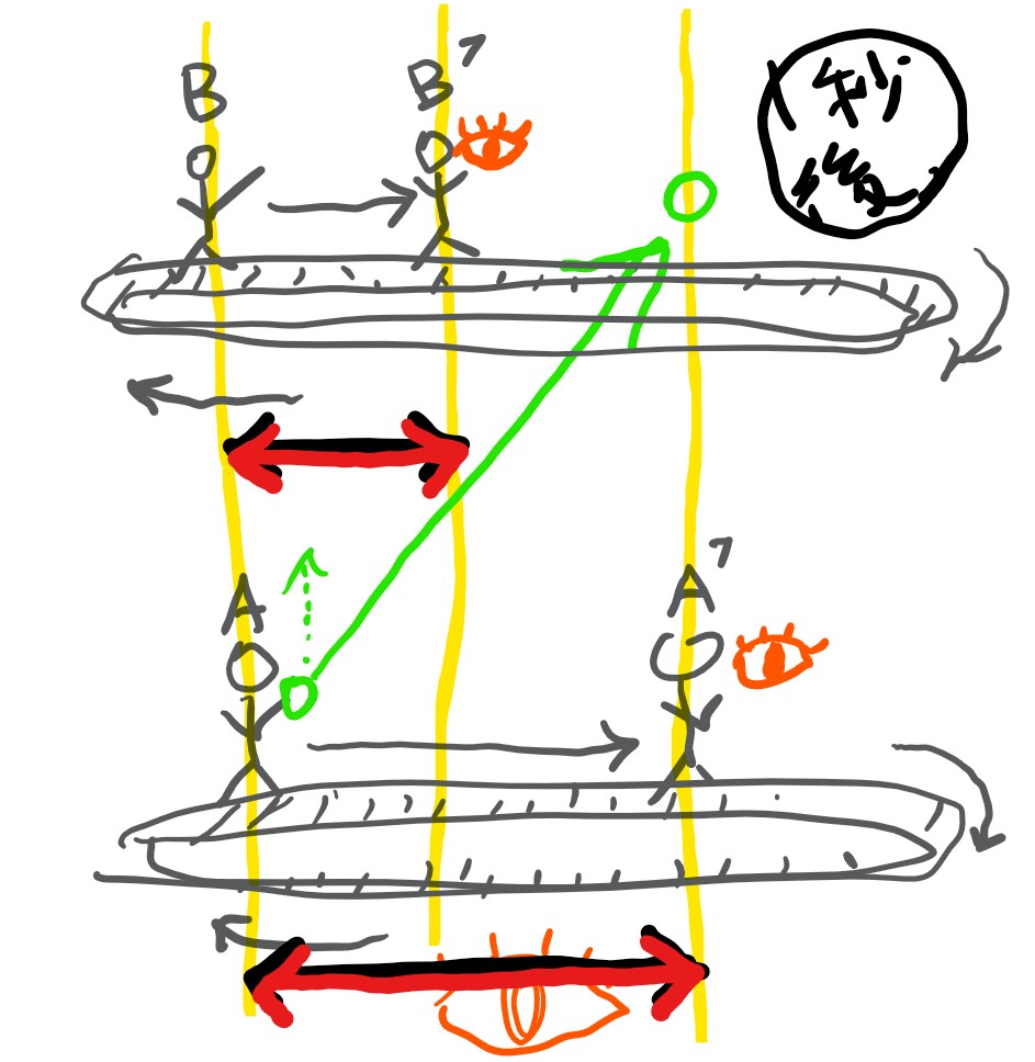 するとAからB’へ斜めにボールが走っている。(実際の現象)