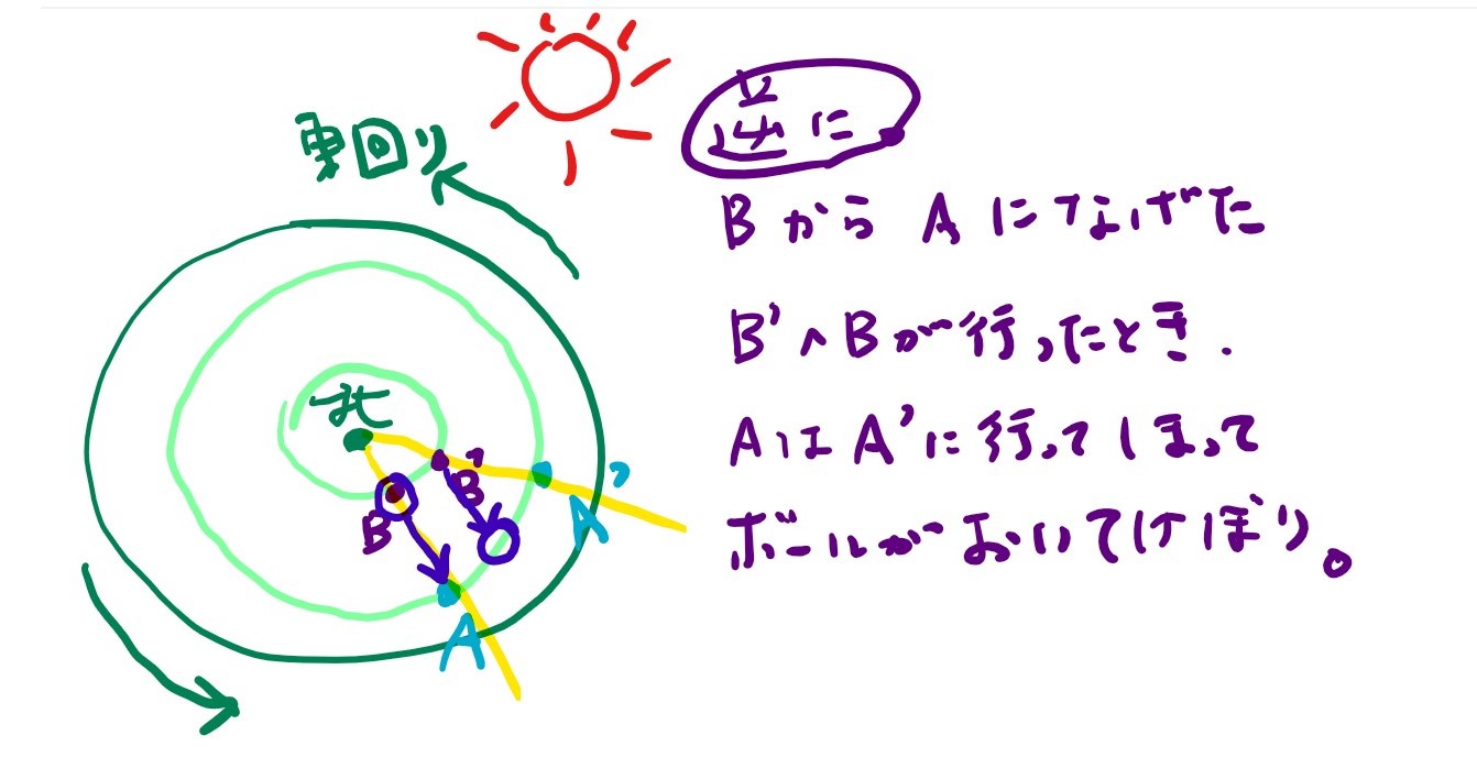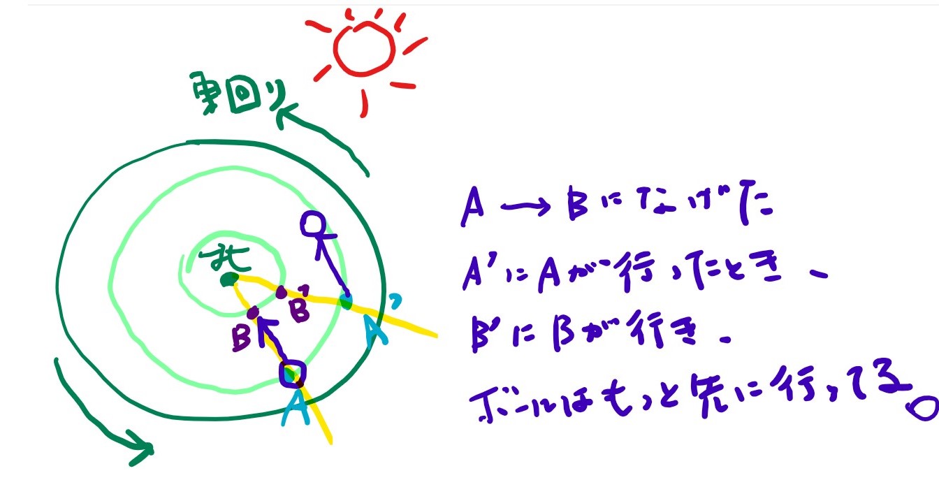 Aから見ると、真横にボールが進んでいるように見える。(みかけの力)