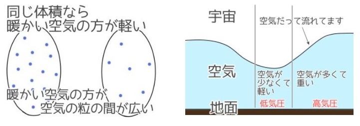 温かいと体積が膨張する。膨張した体積込みで空気分子の量を比較すると同じだけど、単位体積当たりにすると、中身が薄くなる(→気圧が低くなる)