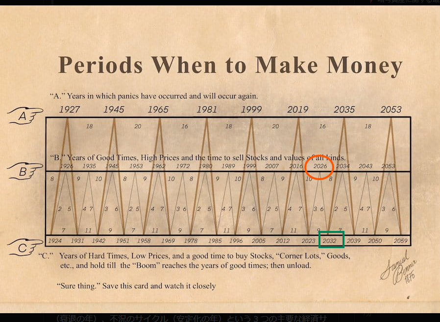 このパターンっていうのは、この金融緩和バブルはいずれ弾けて、世界大恐慌レベルの金融危機がやってくるという、最近ではコロナショック、ちょっと前はリーマンショックといったお決まりのパターンのことなんですけど、今年は中間選挙もあり、トランプ政権も2年目なので、ベナーサイクルという金融界隈ではオカルト指標としてちょっと有名な指標があって、その図によると、2026年の終わりまでに資産を処分しておきましょう。みたいに書いてあるんですよね。