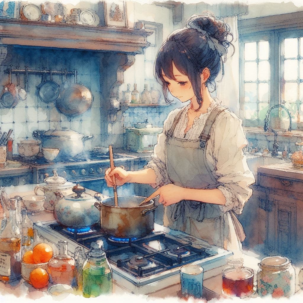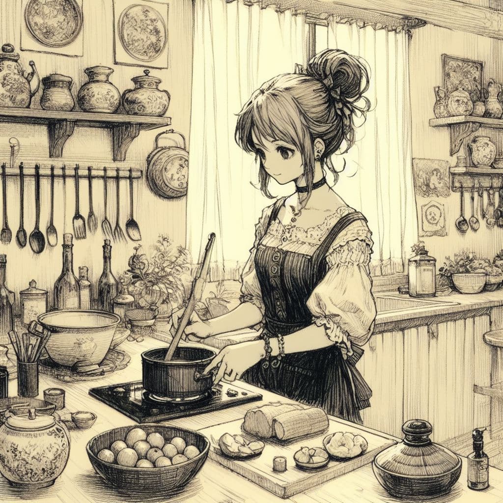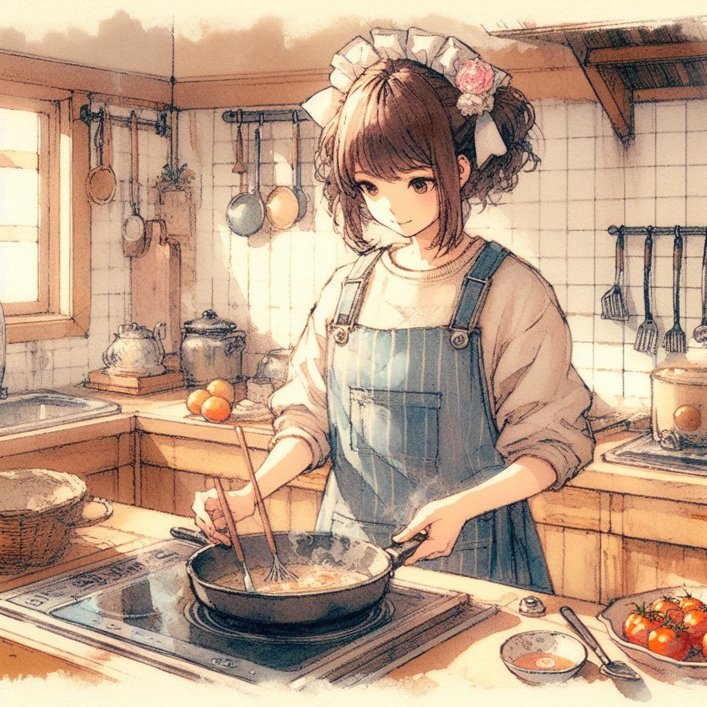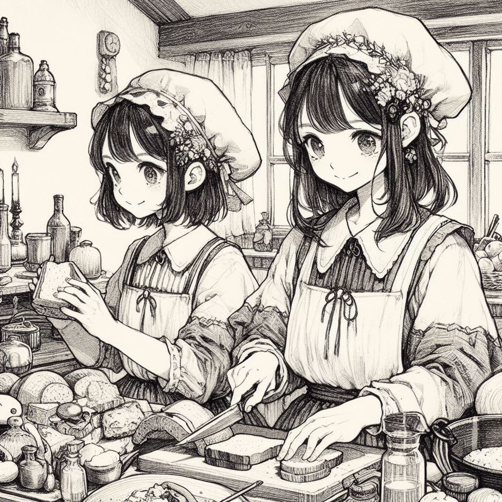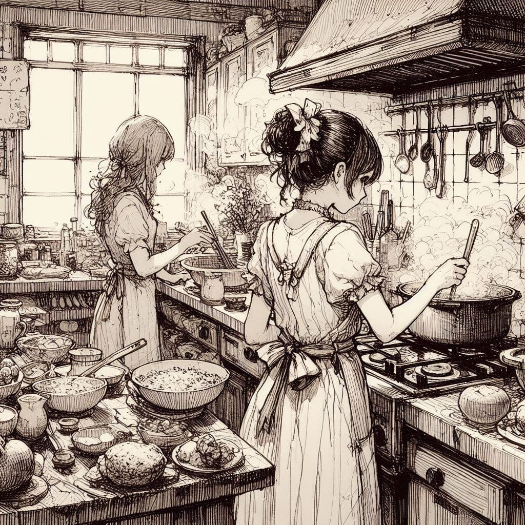 CLAMPを混ぜたら急に料理下手になった……興味深いな。下の子、料理代わってあげたい……不安になる手つき。でもこれはこれで美しい。