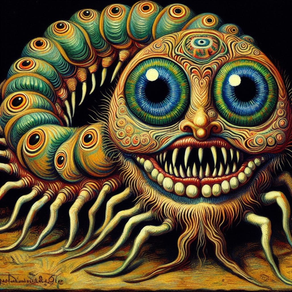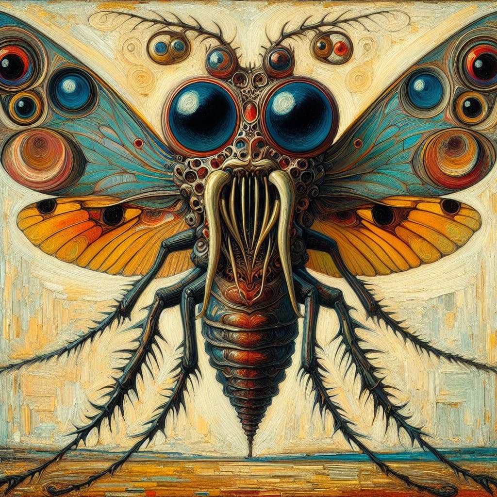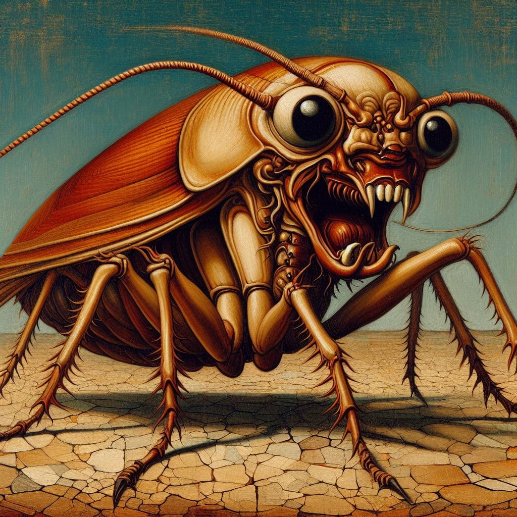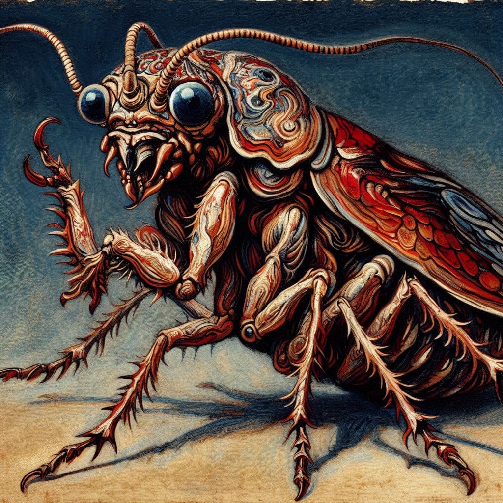 Which one? A cockroach one? It’s very simple. “An oil-drawing of an asymmetric cockroach-monster. It’s very creepy.”