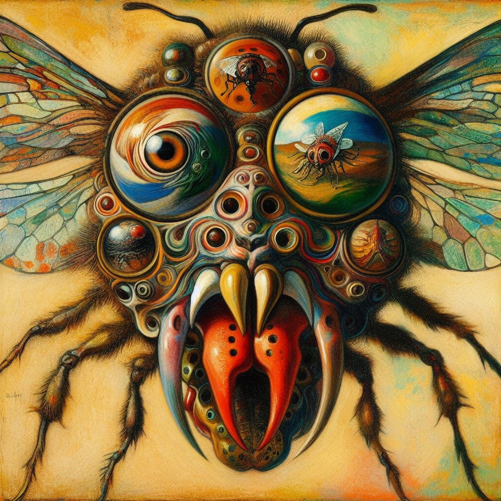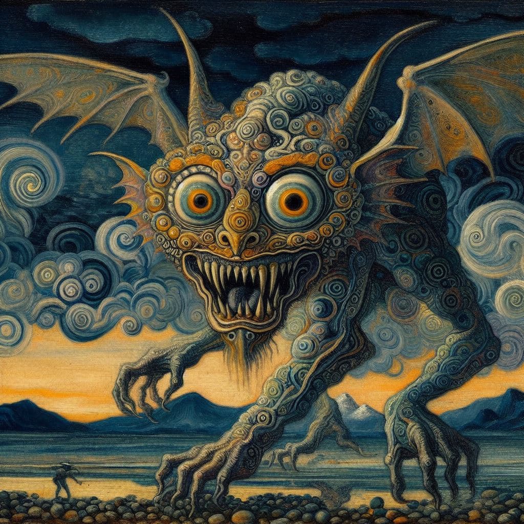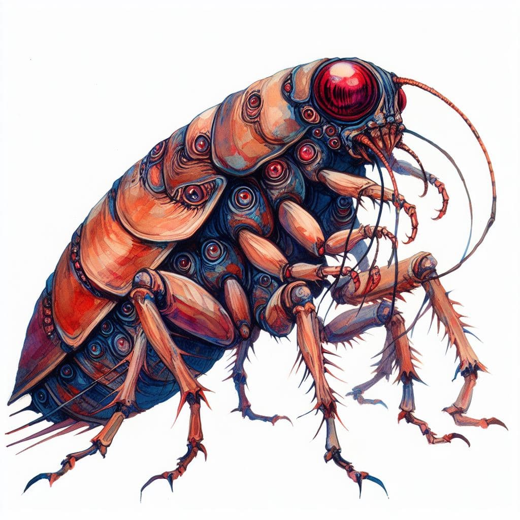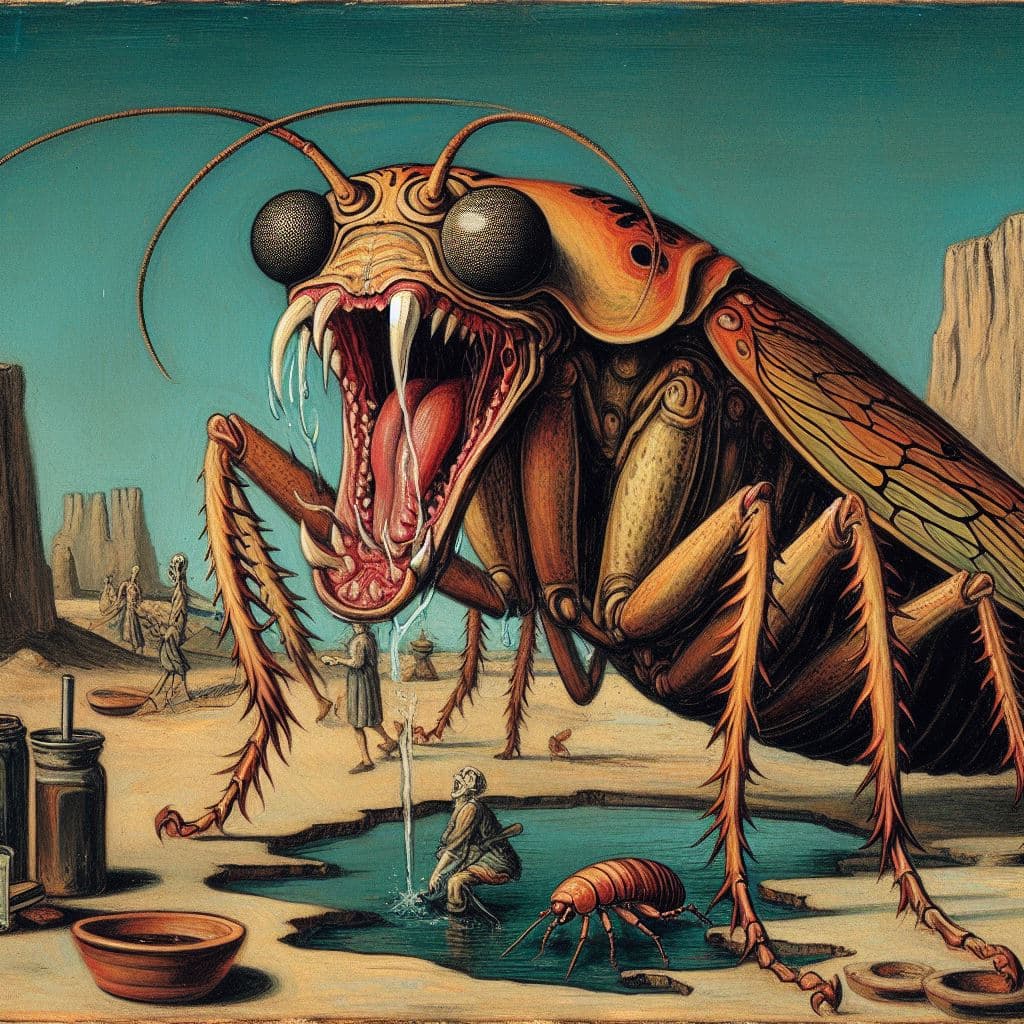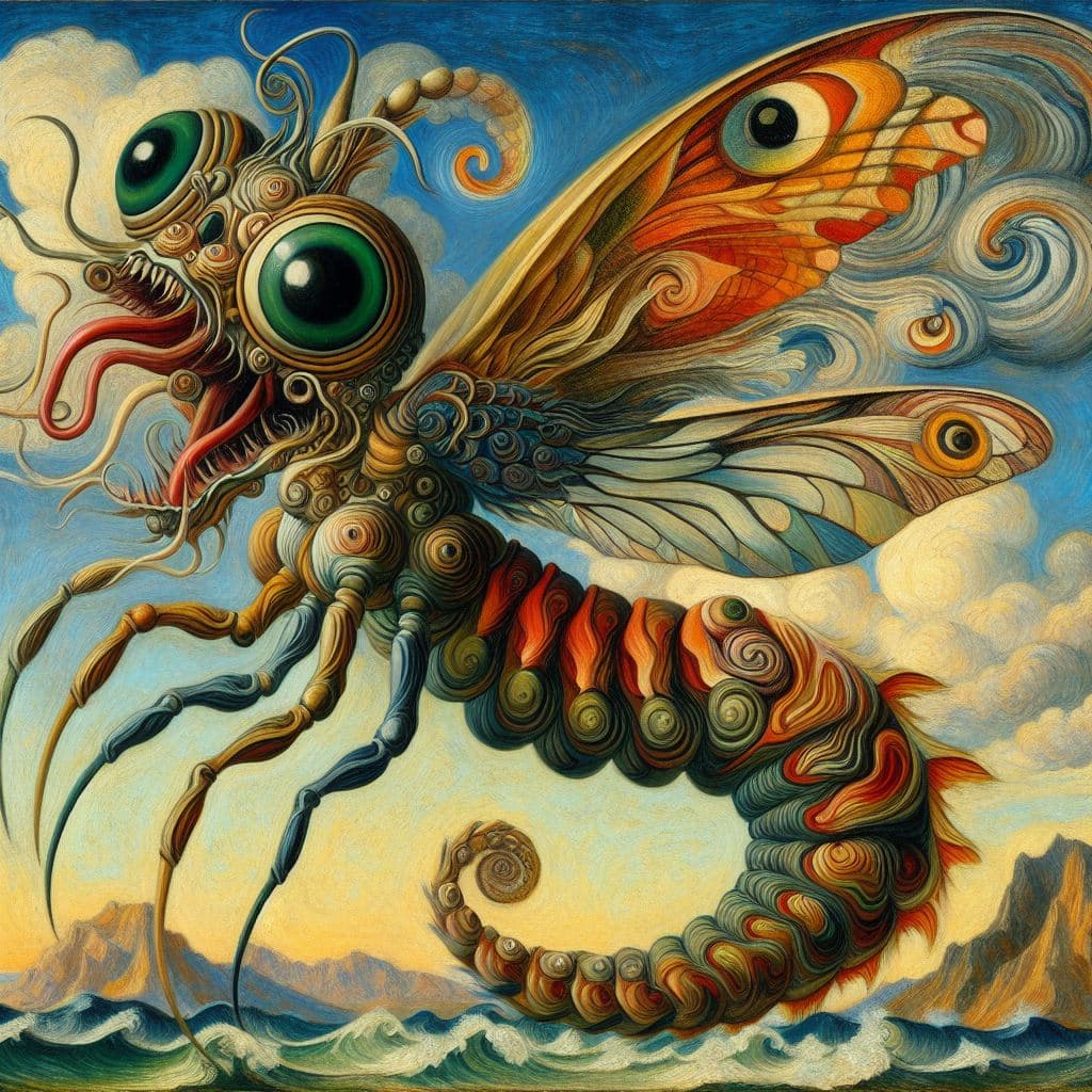 Which one? A cockroach one? It’s very simple. “An oil-drawing of an asymmetric cockroach-monster. It’s very creepy.”