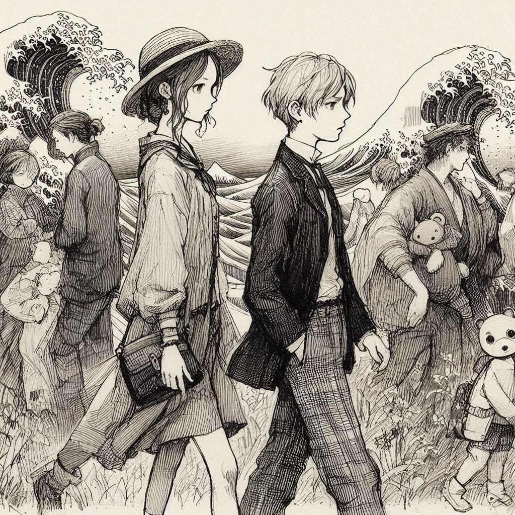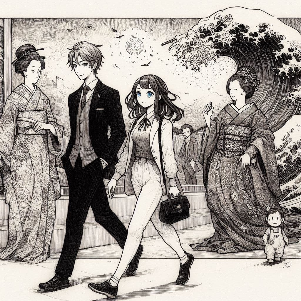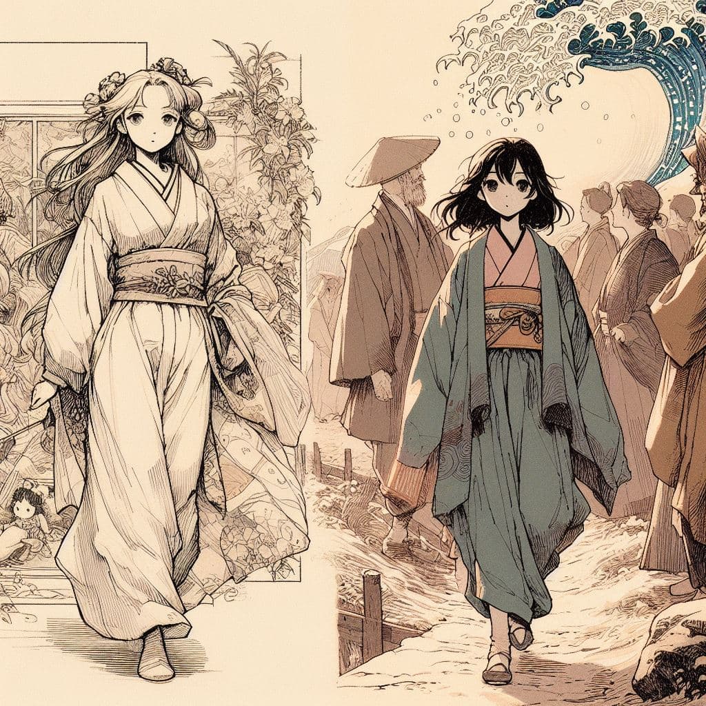 プログラミング方式の命令でもだめ。これはなかなか難しい問題だ。北斎の出現はbing君の混乱を表しているのだろう。 すごい混乱具合だ。どうしたものか。 こういう女性を素直に描いてくれればそれでいいんだが、頑なに並べて描きたがらない。ちょっとやり方が思いつかないな。