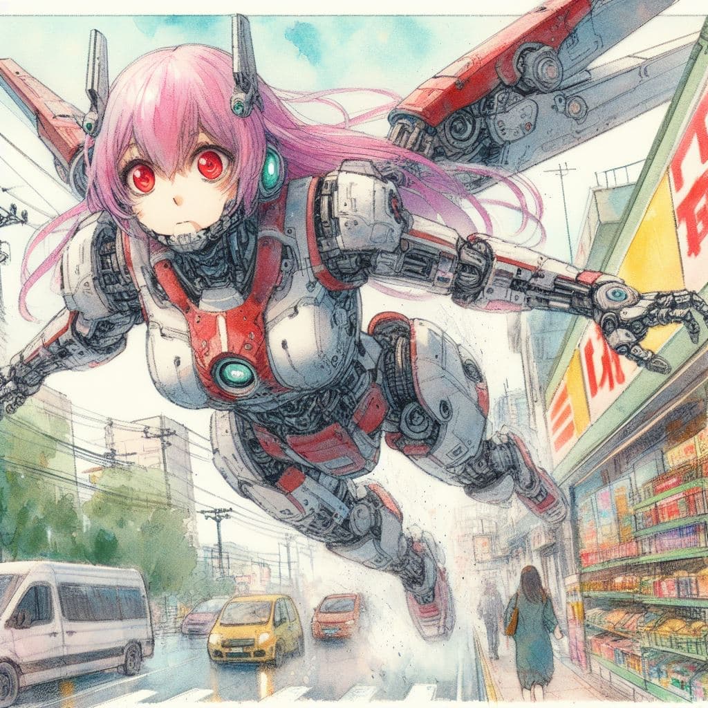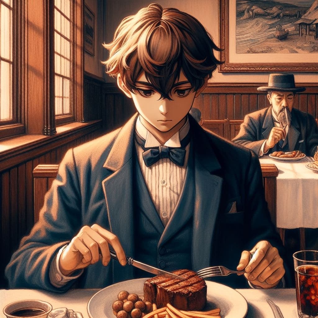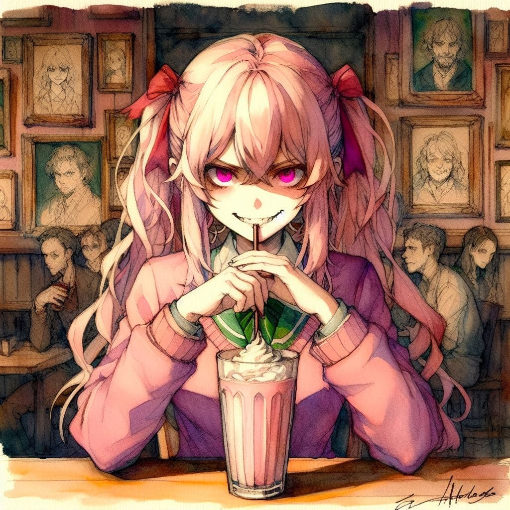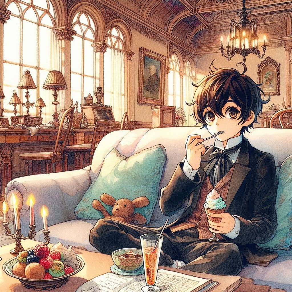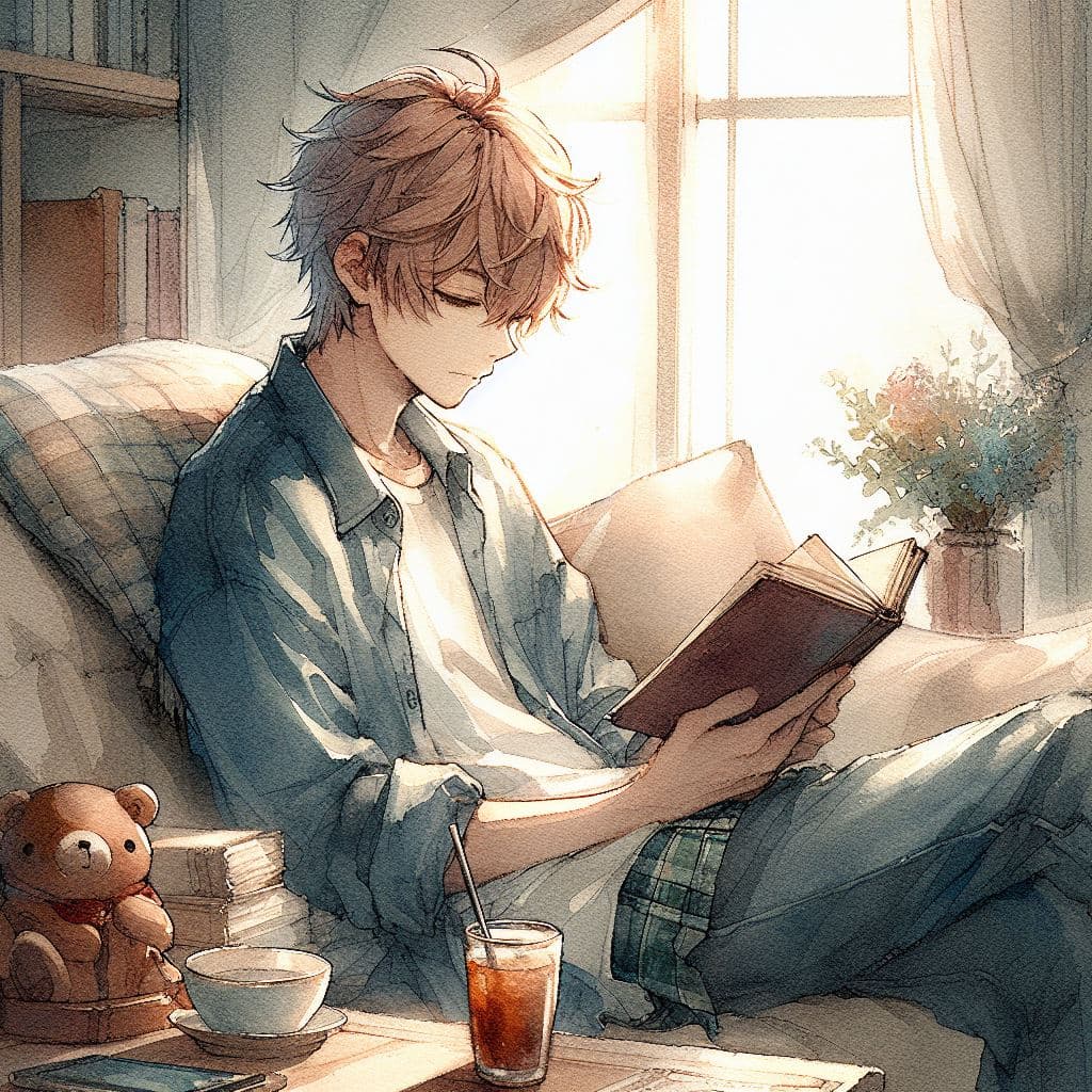 例えば、「アニメ風 スパイファミリー 水彩画 コンビニ前でコーヒーを飲んで空を見上げている少年の絵」