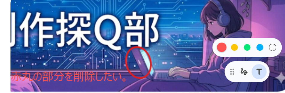 ではGPTさんの指導の下、コーヒーカップらしきもの(左側(閲覧者視点)にある物体はカップだとはっきり認識できるが、赤丸で囲んだものの正体がやや不明なので消したい)を消してみましょう