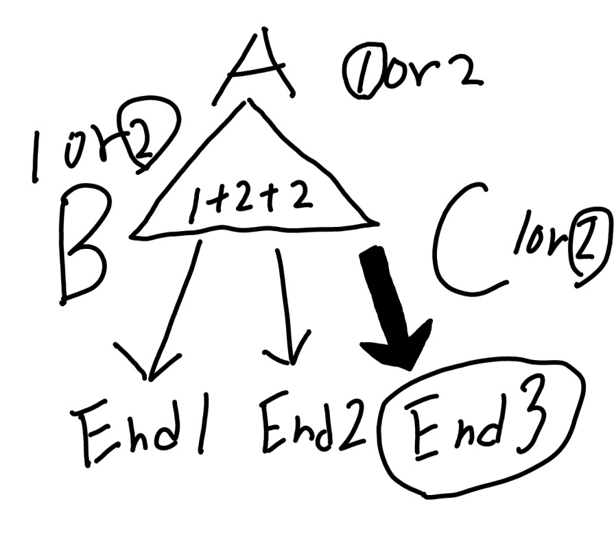 A、B、Cという3つの物語があって、プレイヤーはどれから読んでもいいのですが、物語ごとに1か2の分岐を選択することで、ストーリーが変化します。